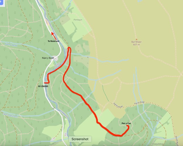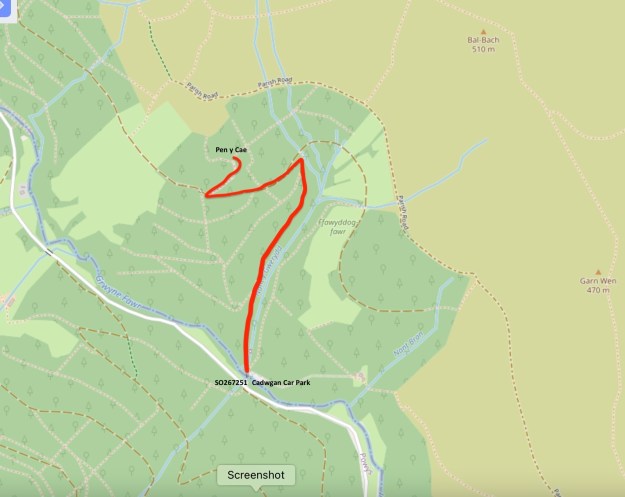 Alternatively, you can park in the NRW Car Park at Cadwgan (OS SO267251) and walk up the forest road (0.75 mile) through the barrier to the left as you look from the bridge. See lower map.